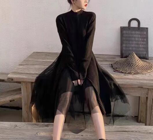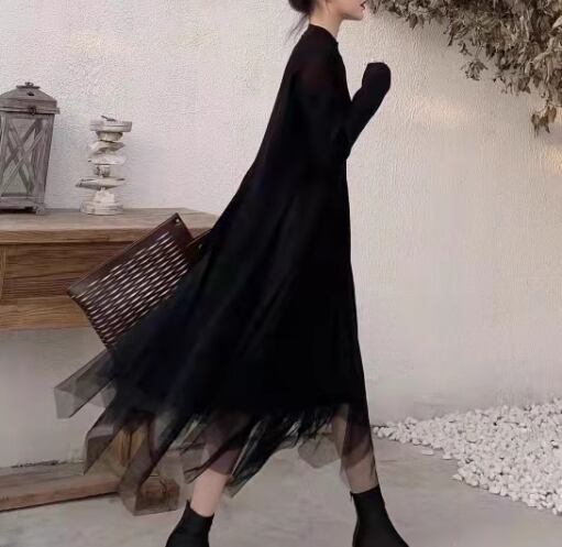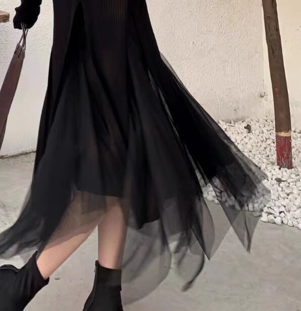 二点セット 上下セット ツーピース レディース スカート トップス プルオーバー セットアップ チュールスカート ロングスカート ミモレ ロング 長袖 ラウンドネック Aライン ハイウエスト ストレッチ 伸縮性 メッシュ 大人可愛い きれいめ シンプル カジュアル 上品 おしゃれ かっこいい ガーリー 個性的 クール エレガント モダン 存在感 ラグジュアリー シック 高級感 スタイリッシュ 無地 秋 冬 デート お出かけ 普段使い 着回し トレンド 流行 M L XL ブラック