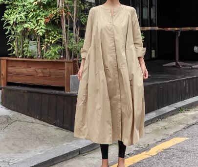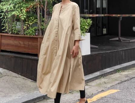 シックなカラーが大人可愛い、長袖のノーカラーシャツワンピース。