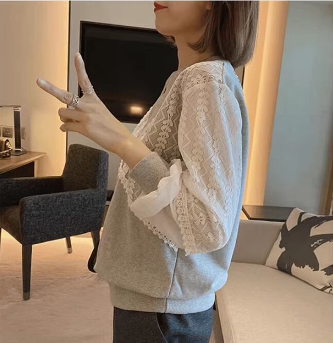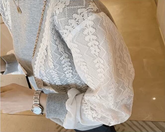 華やかでかわいいレース袖スウェットプルオーバー。