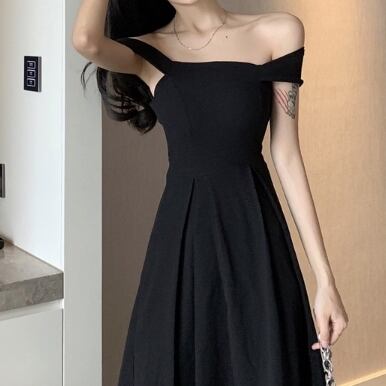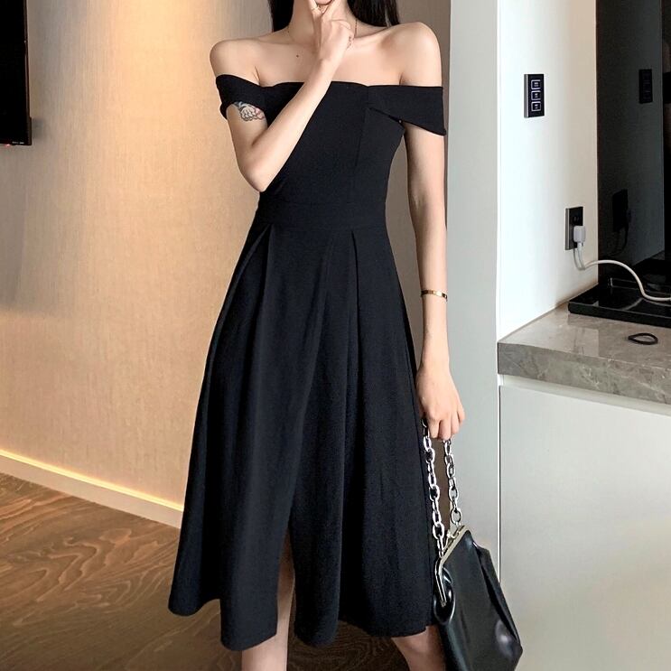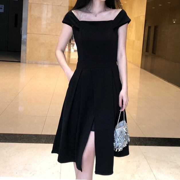 レディース ドレス ワンピース パーティードレス 二次会 披露宴 膝丈 オフショル フレア Aライン スリット シンプル 上品 おしゃれ クール エレガント フォーマル 清楚 エレガント セクシー シック 無地 パーティー 美脚 高見え 格上げ シーズンレス S M L ブラック