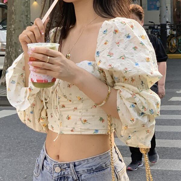 フレンチ花柄スクエアカラーシャツレディース トップス シャツ ブラウス プルオーバー ショート 長袖 パフスリーブ ベルスリーブ スクエアネック スリム タックプリーツ レースアップ ふっくら 薄手 エレガント キュート オフィスカジュアル 大人可愛い 花柄 プリント バイカラー 10代 20代 オフィス 通勤 お出かけ イベント ショッピング カフェ 韓国 トレンド