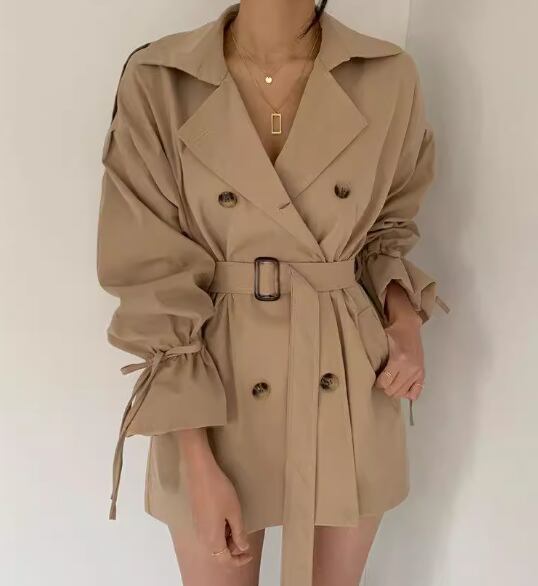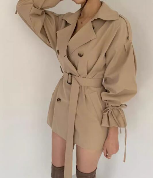 ショート丈のトレンチコートが登場しました!洗練されたスタイルで、おしゃれ度がぐっと上がる一着です。ウエストマークベルトでフィット感を調節でき、女性らしいシルエットを演出します。さらに、ポケット付きで機能性も抜群!上品な印象を与える襟付きのデザインで、季節感を演出します。