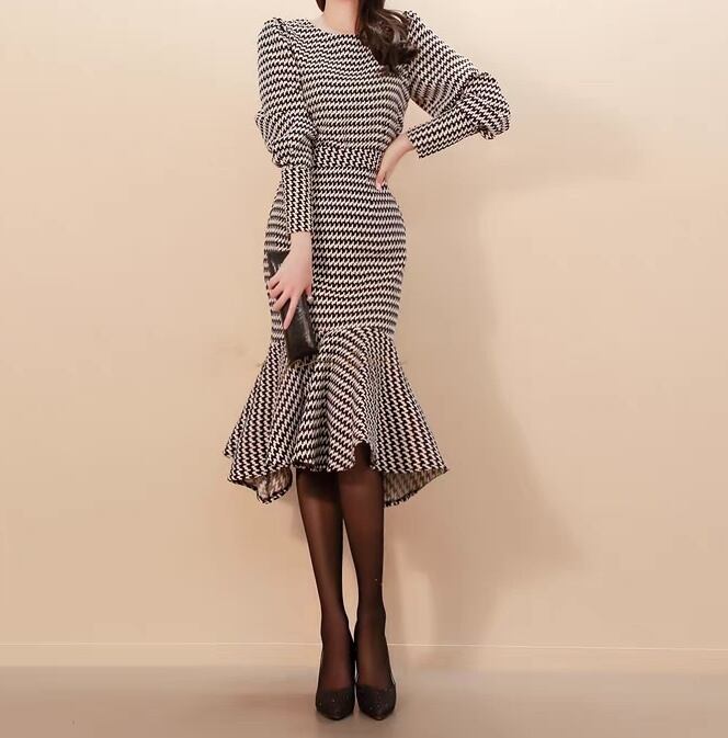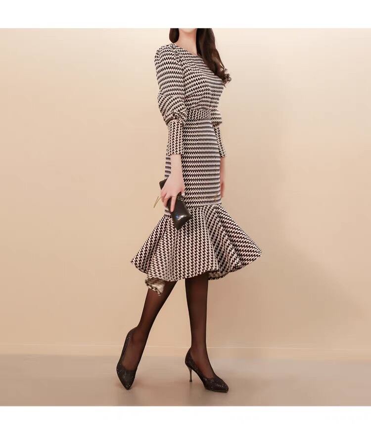 レディース スカート トップス セットアップ 膝下 ミモレ 長袖 バルーン袖 ラウンドネック マーメイド フェミニン フリル ハイウエスト 切り替えデザイン かわいい 大人可愛い きれいめ 上品 おしゃれ レトロ ガーリー エレガント モダン フォーマル ラブリー キュート ベーシック ロマンティック チェック 格子柄 千鳥格子 春 秋 デート お出かけ パーティー イベント 休日 脚長 普段使い 着回し モテ 清楚 トレンド 流行 インスタ映え S M L XL 小さいサイズ 大きいサイズ 黒 ブラック