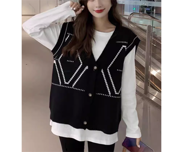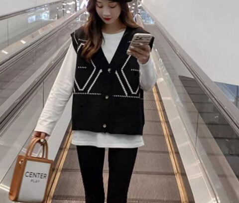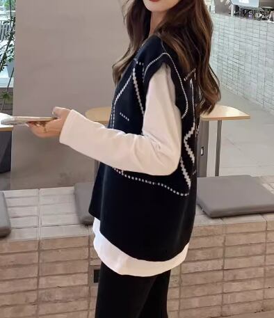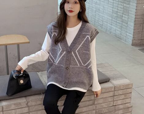 シックなカラーと大人可愛い菱形模様が魅力的なノースリーブベスト。