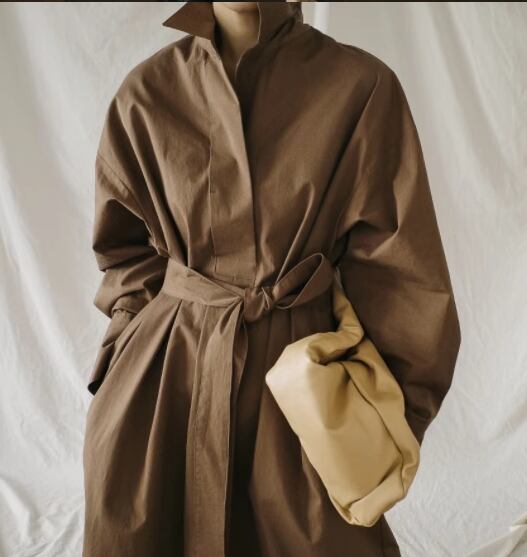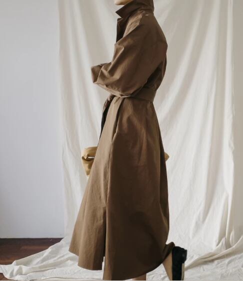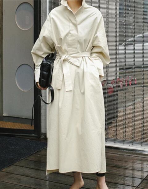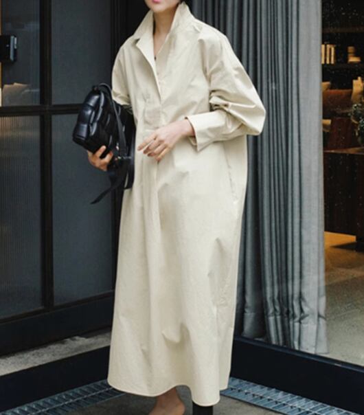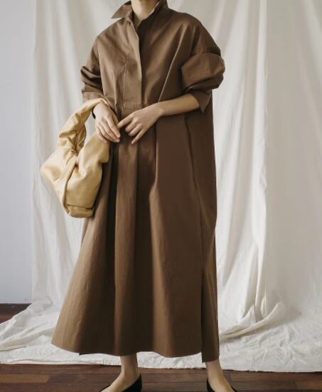 シックな秋カラーとスタイリッシュなデザインが大人可愛い、長袖のロング丈シャツワンピース。