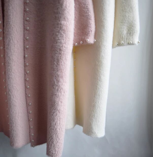 パール風のビーズがアクセントになった上品で大人っぽい雰囲気のニットカーディガン。