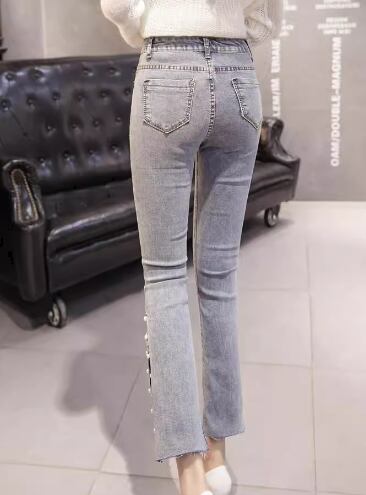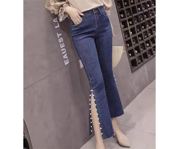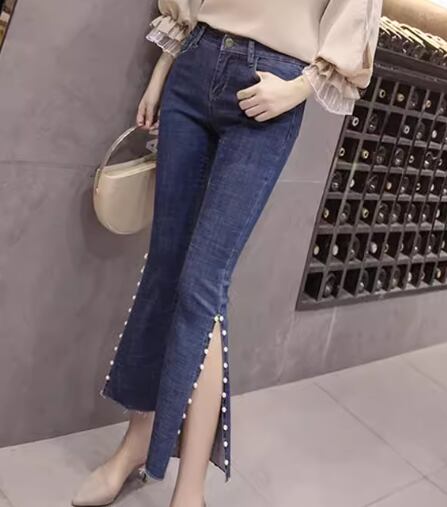 レディース パンツ ボトムス デニム ジーンズ Gパン デニムパンツ 9分丈 クロップド丈 タイト スリム 細身 ブーツカット スリット ハイウエスト ビーズ ストレッチ 伸縮性 かわいい 大人可愛い きれいめ カジュアル 上品 おしゃれ かっこいい こなれ感 ラフ ガーリー 個性的 エレガント ラグジュアリー セクシー シック 高級感 スタイリッシュ 無地 秋 デート お出かけ 韓国 美脚 脚長 普段使い 着回し トレンド 流行 S M L XL ネイビー ライトブルー