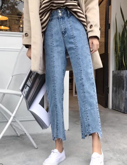 レディース パンツ ボトムス デニム ジーンズ Gパン 9分丈 アンクル丈 フルレングス ワイド ストレート ハイウエスト ボタン ダメージ シンプル カジュアル おしゃれ かっこいい レトロ こなれ感 ラフ ボーイッシュ ルーズ 個性的 クール ナチュラル ハンサム シック 高級感 スタイリッシュ 無地 春 デート お出かけ 脚長 普段使い 着回し トレンド 流行 L XL 大きいサイズ ゆったり ブルー