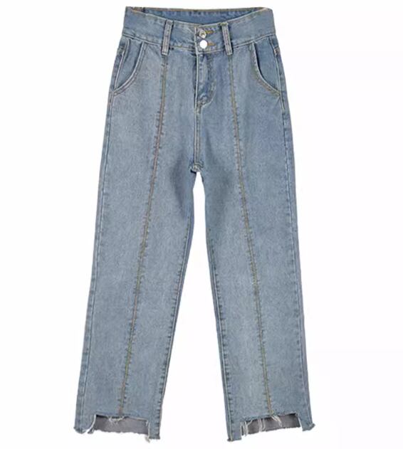 裾部分のダメージ加工がおしゃれな、アンクル丈のストレートデニム。