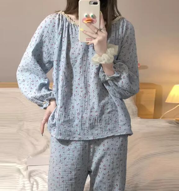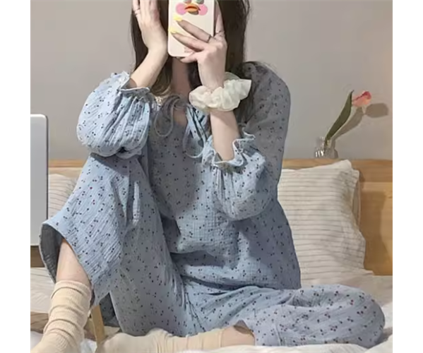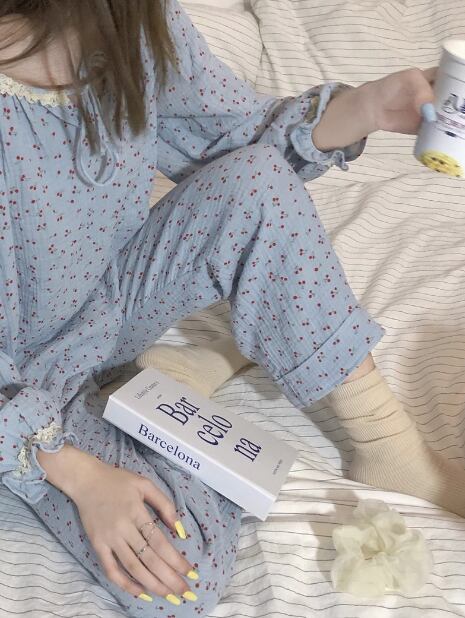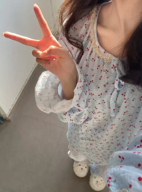 爽やかで上品なブルー×レトロなチェリー柄が可愛い長袖パジャマの上下セット。