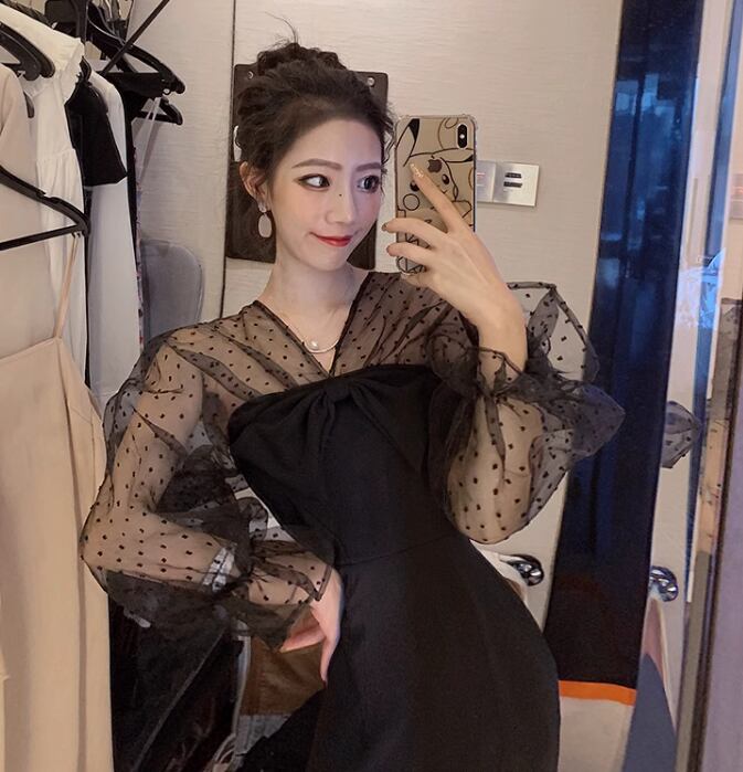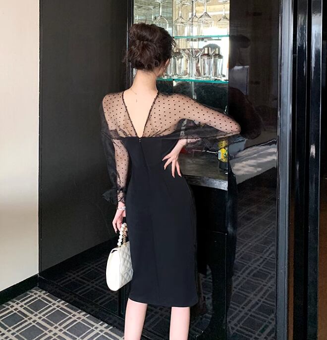 ドレス ドレスワンピ パーティー 結婚式 二次会 披露宴 ステージ フォーマル ラウンジ クラブ ひざ丈 長袖 ボリューム 袖あり Vネック 襟なし ストレート Iライン イブニング リボン スリット 切り替えデザイン ファスナー ハイウエスト 透け感 可愛い きれいめ 大人可愛い 上品 おしゃれ エレガント 主役級 存在感 フォーマル シック 華やか ドット 無地 イベント レストラン 二の腕カバー 美脚 脚長 高見え プチプラ 女子会 春 秋 S M L 秋カラー 大人カラー 黒 ブラック