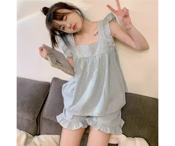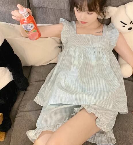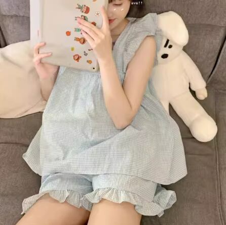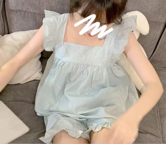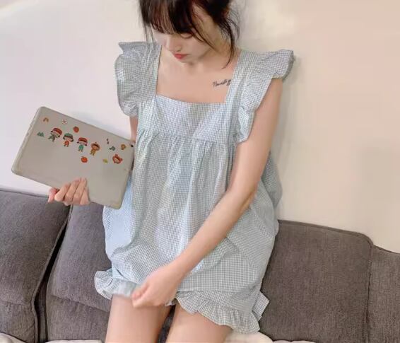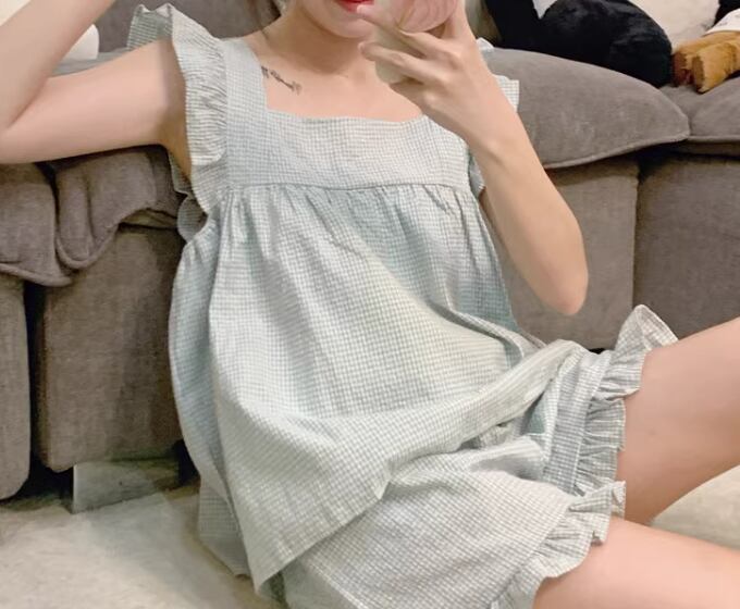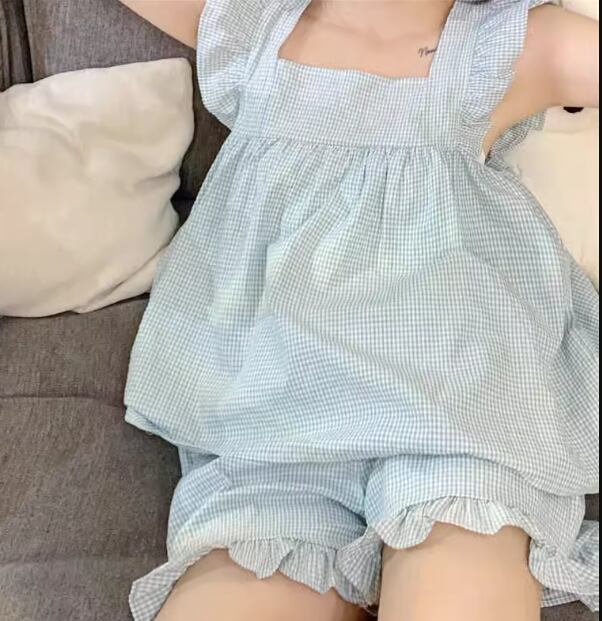 二点セット 上下セット ツーピース レディース ルームウェア パジャマ プルオーバー 部屋着 セットアップ 寝巻き ショートパンツ 袖なし ノースリーブ スクエアネック フェミニン フリル ウエストゴム 薄手 かわいい カジュアル おしゃれ ラフ ガーリー ルーズ ラブリー キュート ラグジュアリー アクティブ 清潔感 爽やか セクシー リラックス シック 高級感 華やか 優しい 穏やか フェアリー 涼しげ チェック プリント 夏 お泊まり 楽ちん 普段使い ゆったり フリーサイズ ブルー