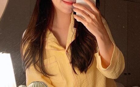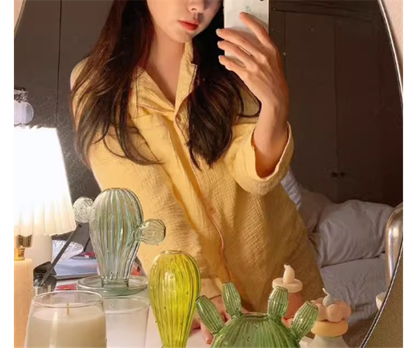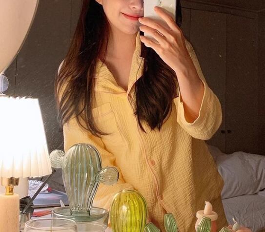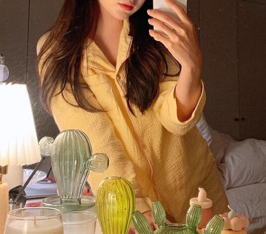 着るだけで元気が出そうな、発色が綺麗なイエローの長袖パジャマの上下セット。