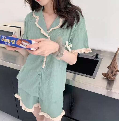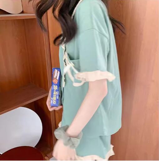二点セット 上下セット ツーピース レディース パジャマ セットアップ 寝巻き ショートパンツ 半袖 フェミニン レース フリル リボン ウエストゴム 薄手 綿 かわいい カジュアル 上品 おしゃれ ラフ ガーリー ルーズ 存在感 ラブリー キュート ロリータ ラグジュアリー アクティブ 清潔感 爽やか セクシー リラックス シック 高級感 華やか 優しい 穏やか フェアリー 無地 夏 お泊まり 楽ちん 普段使い モテ M L XL ゆったり グリーン