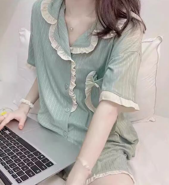 青みグリーンの色味がとてもきれいな半袖パジャマの上下セット。