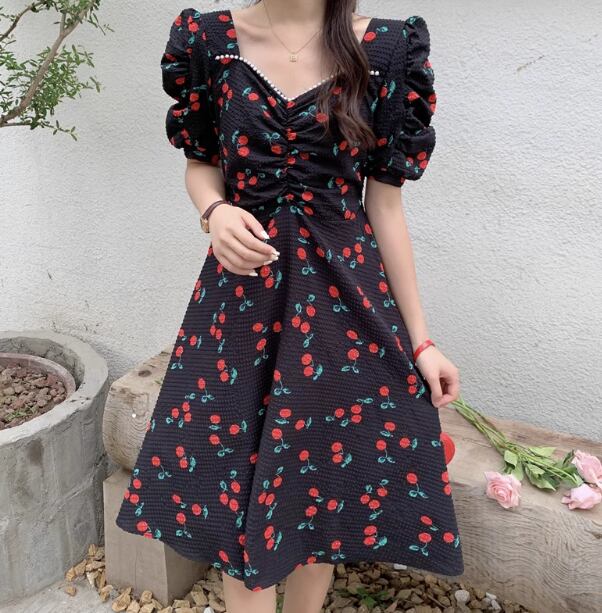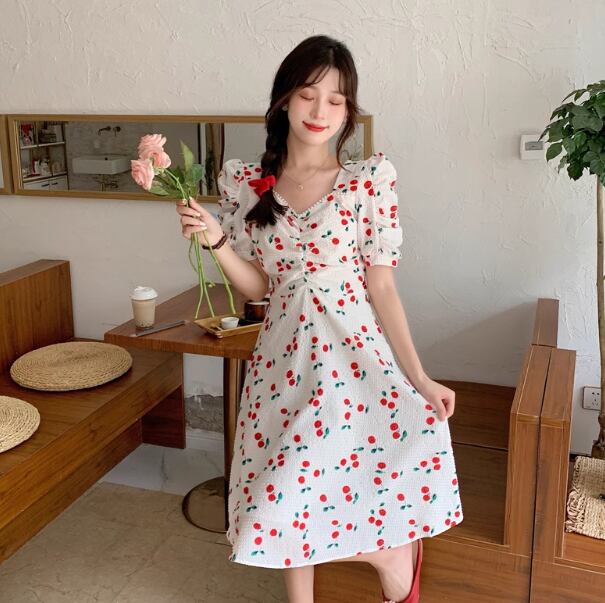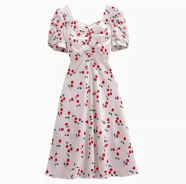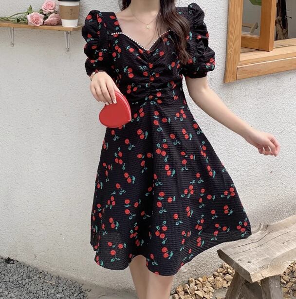 このワンピースはAラインでウエストリボンが付いているので、誰でも簡単にスタイルアップが叶います。バルーン袖やチェリー柄がレトロ感を演出し、ミモレ丈なので大人可愛い印象を与えます。大きいサイズまで展開しているので、幅広い方にお楽しみいただけます。デートや女子会、リゾートや婚活など、さまざまなシーンで活躍すること間違いなし!