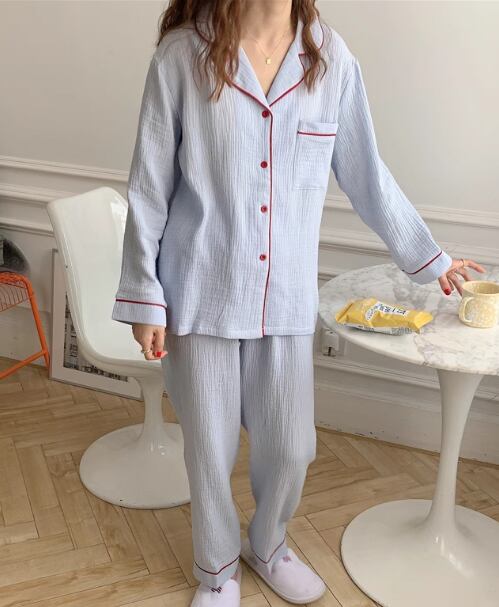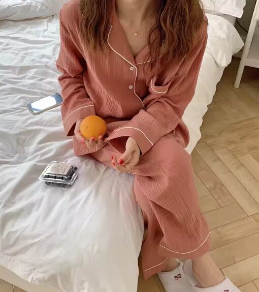 二点セット 上下セット ツーピース レディース パジャマ セットアップ 寝巻き フルレングス 長袖 襟付き 前開き ウエストゴム ボタン 綿 ガーゼ かわいい 大人可愛い きれいめ シンプル カジュアル 上品 おしゃれ レトロ ラフ ルーズ エレガント キュート ベーシック ナチュラル 清潔感 リラックス シック 高級感 優しい 穏やか 柔らかい 無地 春 秋 お泊まり 楽ちん 普段使い 清楚 ゆったり フリーサイズ ブラウン イエロー ピンク ブルー ライトブルー