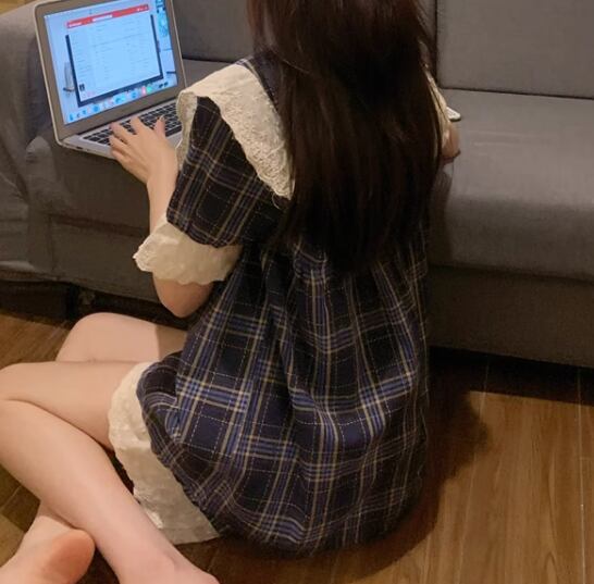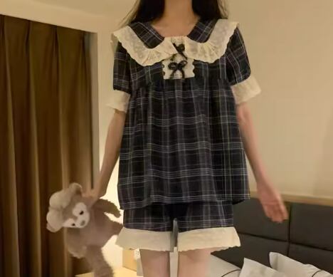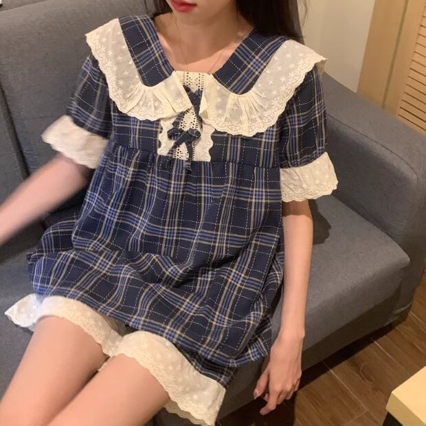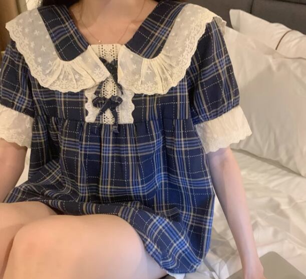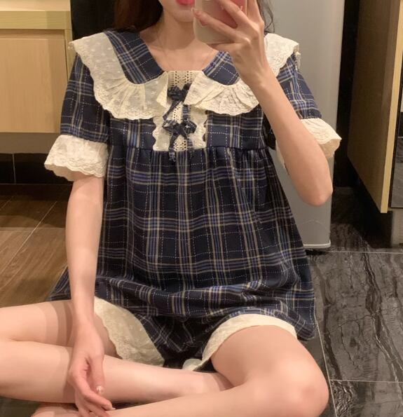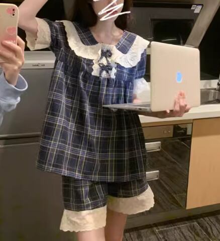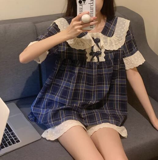二点セット 上下セット ツーピース レディース ルームウェア パジャマ プルオーバー 部屋着 セットアップ 寝巻き ショートパンツ 半袖 ラウンドネック 襟付き フェミニン レース フリル リボン ウエストゴム 綿 かわいい カジュアル おしゃれ ラフ ガーリー ルーズ 存在感 ラブリー キュート ラグジュアリー セクシー リラックス シック 高級感 華やか フェアリー 涼しげ チェック 夏 10代 20代 学生 お泊まり 楽ちん 普段使い モテ M L XL ゆったり ブルー