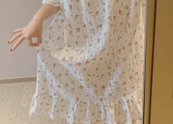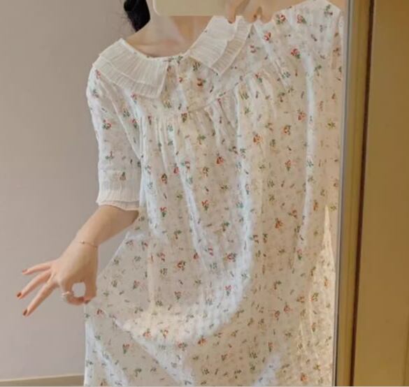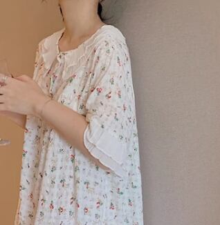 繊細で上品な小花柄のプリントが女性らしい、ワンピースタイプの半袖パジャマ。