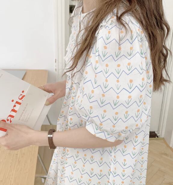 レトロなプリントが可愛らしい、ワンピース型の半袖パジャマ。