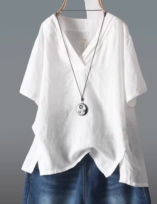 シンプルで清楚なVネックブラウスは、女性らしさを引き立てる一枚です。オーバーサイズのデザインで、体型をカバーしながらも上品に着こなせます。薄手の素材感が夏にぴったりで、気軽におしゃれを楽しめるアイテムです。
