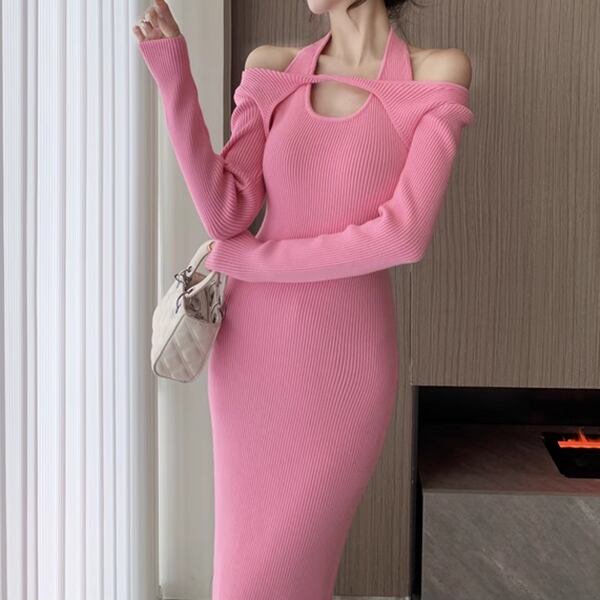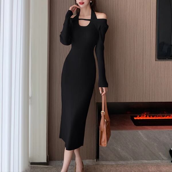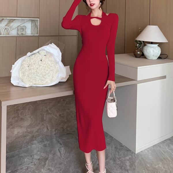 シンプルで洗練されたデザインが魅力のレディースニットワンピース!長袖で、Uネック襟のデザインが個性があり女性の魅力を感じさせるドレスです。タイトなハイウエストのシルエットが美しく、上品で高貴なレディを演じさせてくれます。
