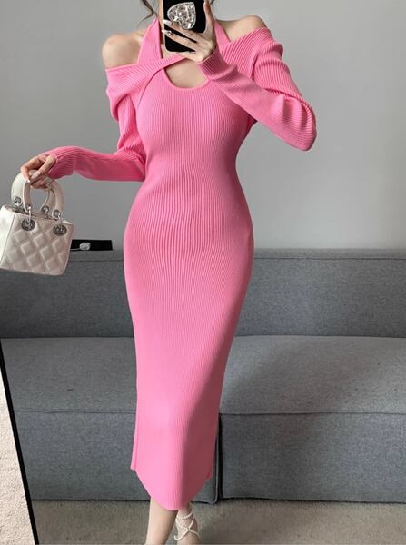 4色展開レディース ワンピース ニット プルオーバー ドレス ニットワンピ タイトスカート ニットスカート ペンシルスカート ロングスカート ロング 長袖 Uネック 襟なし タイト ハイウエスト リブニット 伸縮性 大人可愛い 上品 エレガント フォーマル セクシー 高級感 無地 春 夏 秋 お出かけ パーティー レストラン ホテル ショッピング コンサート 韓国