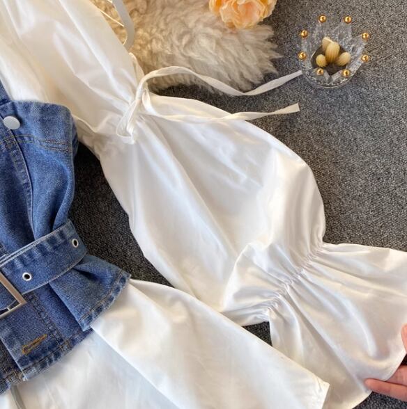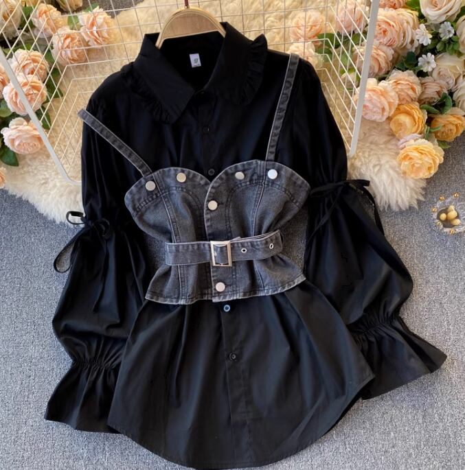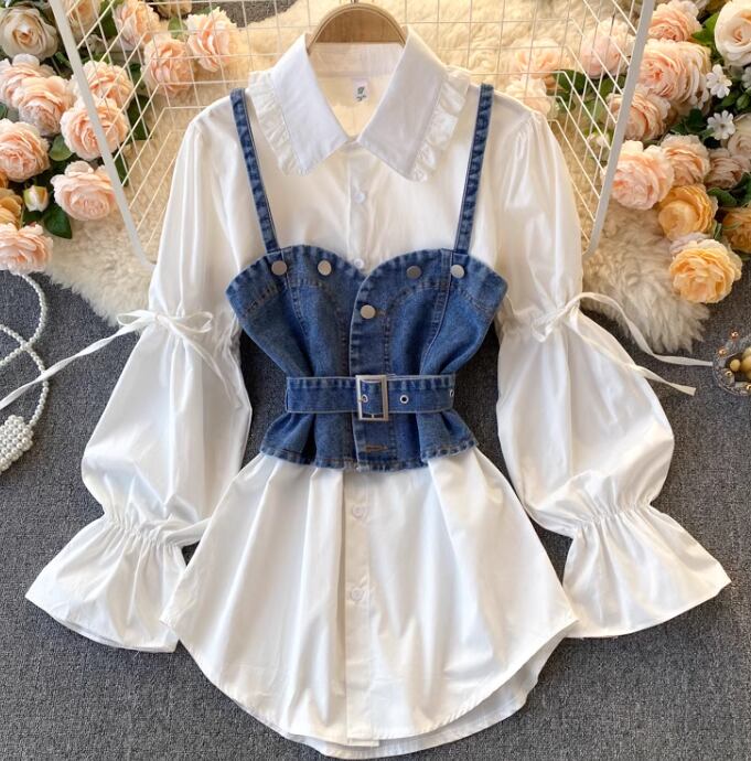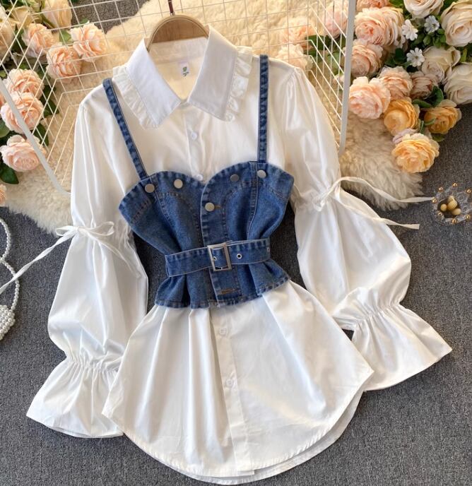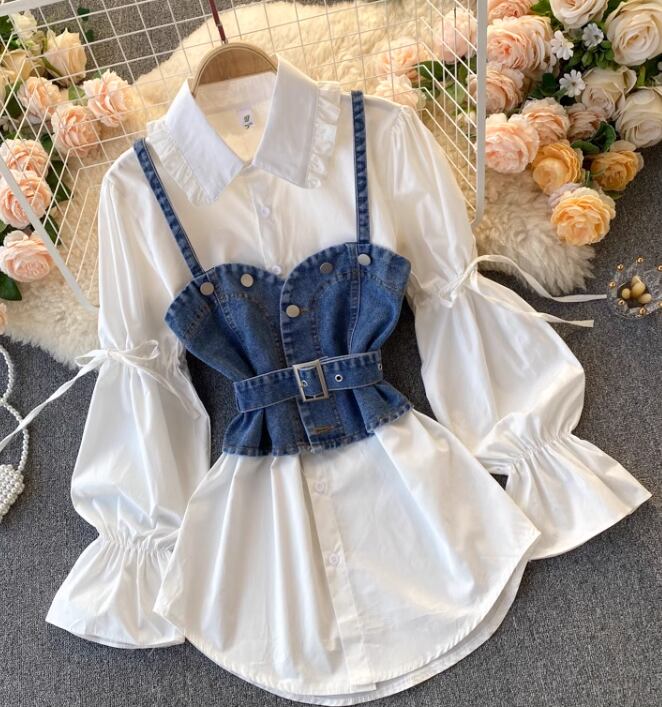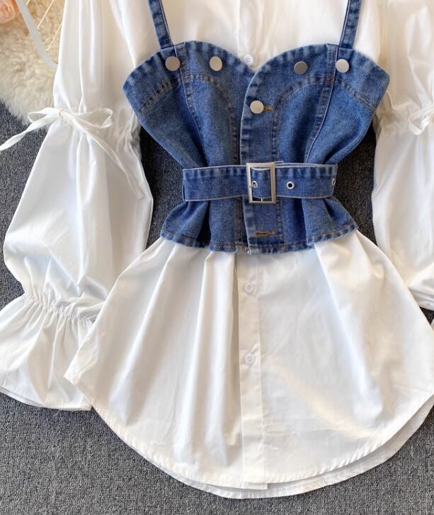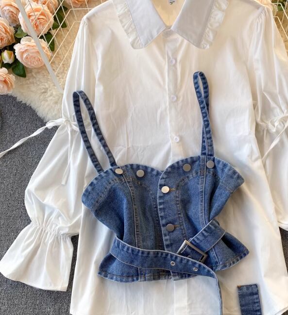 二点セット レディース トップス シャツ ブラウス セットアップ 袖なし 長袖 ボリューム袖 キャミソール デニム ブルーデニム かわいい 大人可愛い シンプル おしゃれ こなれ感 ラフ ガーリー ルーズ ラブリー キュート 無地 春 秋 10代 20代 デート お出かけ 重ね着 韓国 オルチャン コーデ 楽ちん 着回し レイヤード モテ 清楚 トレンド 流行 インスタ映え 定番 フリーサイズ