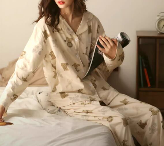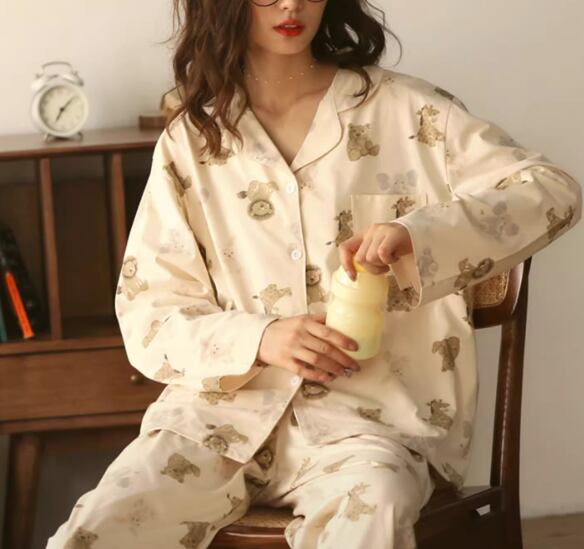 二点セット 上下セット くま レディース パジャマ 部屋着 クマ柄 寝巻き ネグリジェ 長袖 ウエストゴム かわいい 大人可愛い きれいめ シンプル カジュアル 春 秋 お泊まり 動きやすい M L XL 2XL 3XL 4XL ゆったり ゆる クリーム