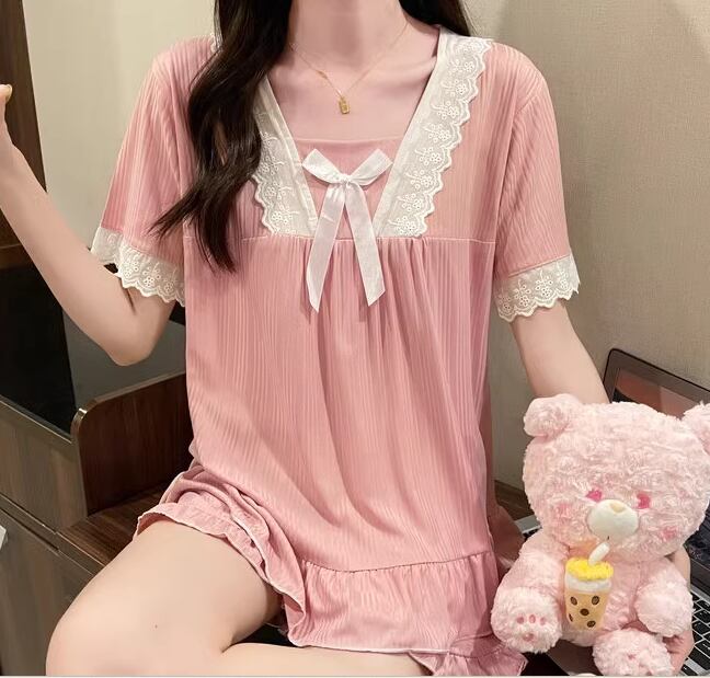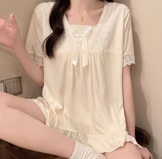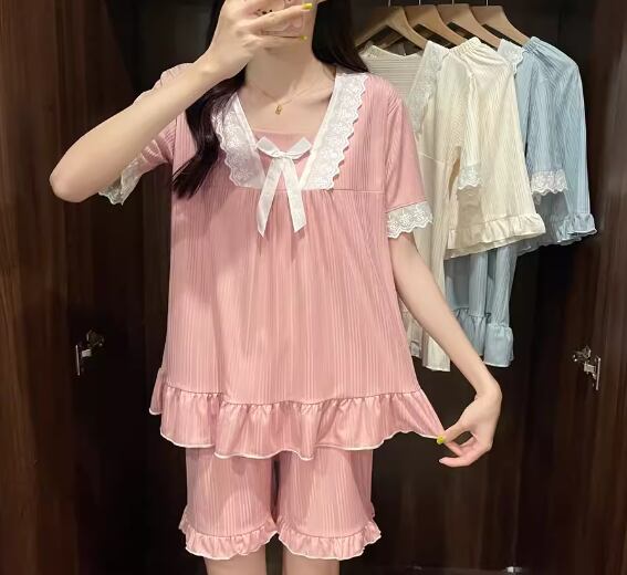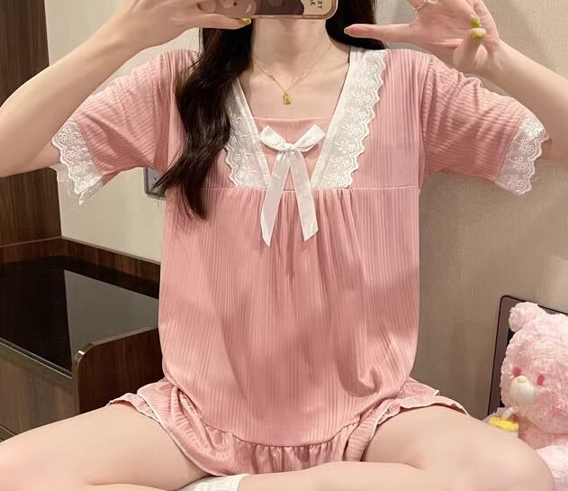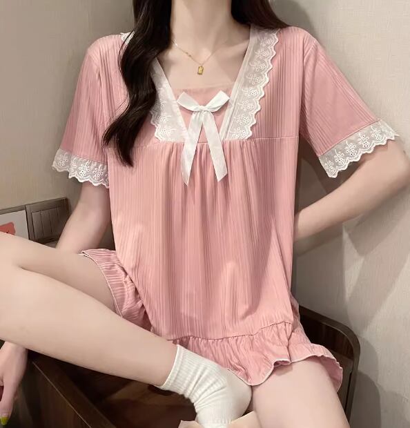 二点セット 上下セット ツーピース レディース パジャマ プルオーバー セットアップ 寝巻き ショートパンツ 半袖 スクエアネック フェミニン レース フリル リボン ウエストゴム 薄手 綿 コットン ニット かわいい カジュアル おしゃれ ラフ ガーリー ルーズ ラブリー キュート ロリータ プリンセス リラックス シック 高級感 華やか 優しい 穏やか フェアリー 無地 夏 10代 20代 学生 お泊まり 普段使い モテ M L XL ゆったり ピンク ブルー アプリコット