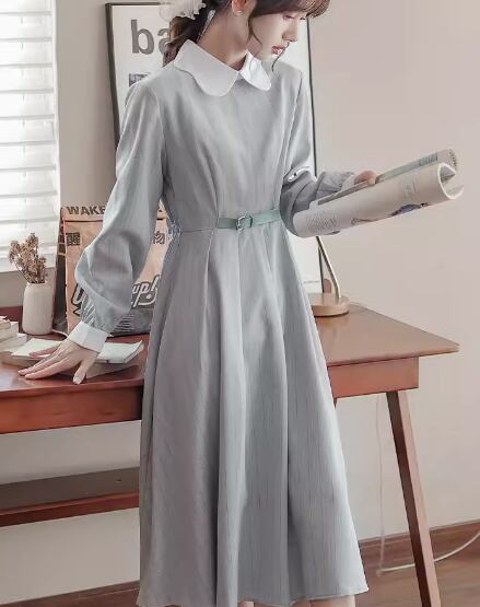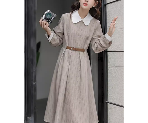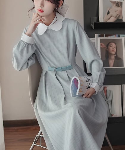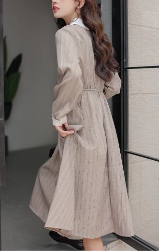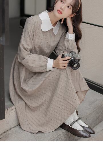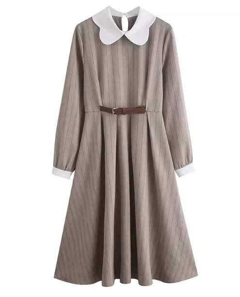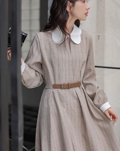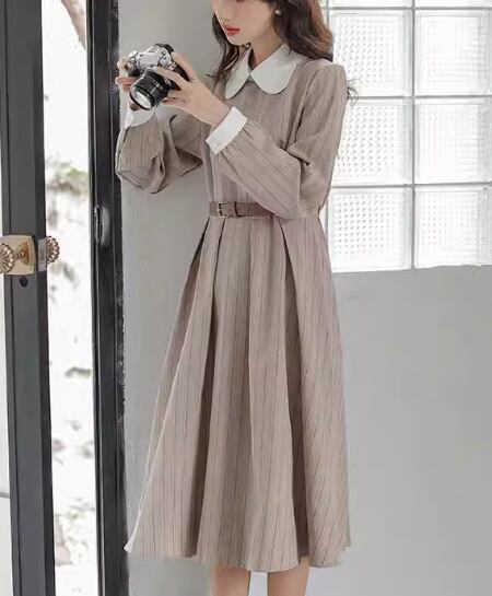 レディース ワンピース ミモレ ロング 長袖 襟付き Aライン フリル ベルト ウエストマーク ハイウエスト ウエストゴム ボタン ストレッチ 伸縮性 かわいい 大人可愛い きれいめ シンプル カジュアル 上品 おしゃれ レトロ ガーリー エレガント ラブリー キュート クラシカル ナチュラル 清潔感 シック 高級感 優しい 穏やか ストライプ 春 秋 デート お出かけ 体型カバー 普段使い 清楚 S M L ゆったり ブラウン ブルー