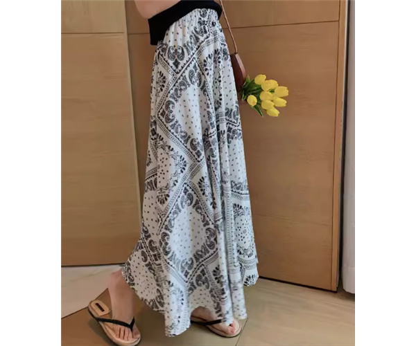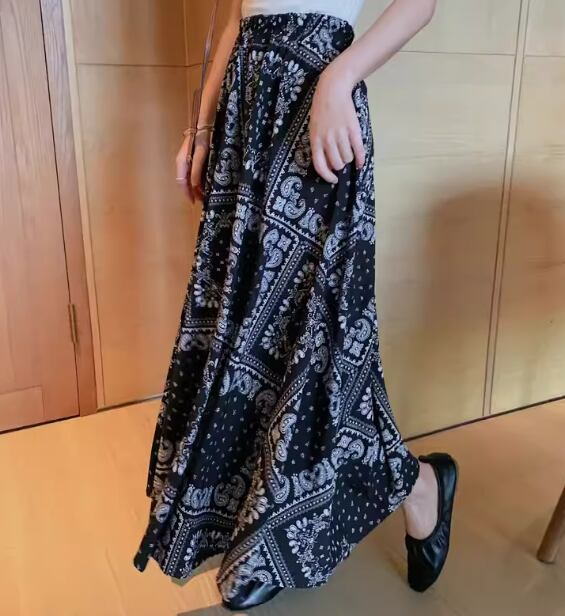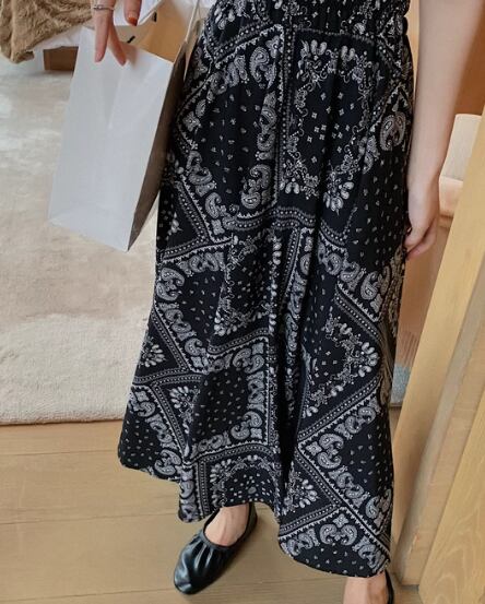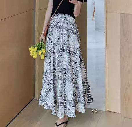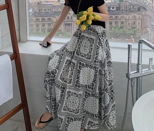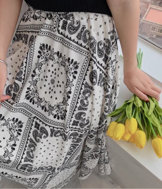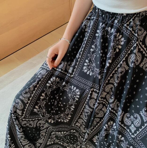 レディース スカート ロングスカート ロング マキシ Aライン シフォン ハイウエスト ウエストゴム 大人可愛い きれいめ カジュアル 上品 おしゃれ レトロ エスニック ガーリー 個性的 エレガント 存在感 シック 高級感 芸術的 アーティスティック 華やか フェアリー プリント ペイズリー 夏 デート お出かけ 楽ちん 脚長 普段使い 着回し トレンド 流行 S M L XL ホワイト ブラック
