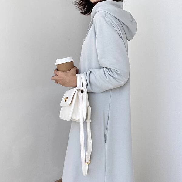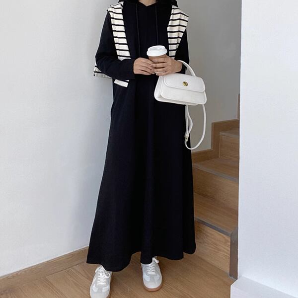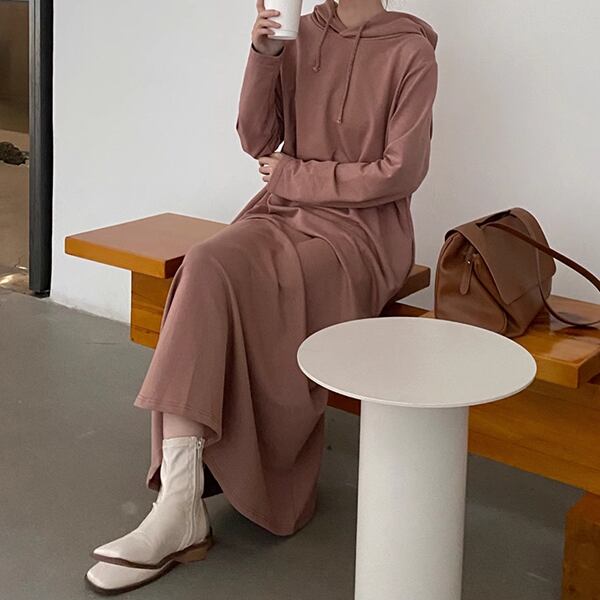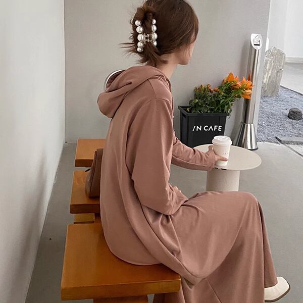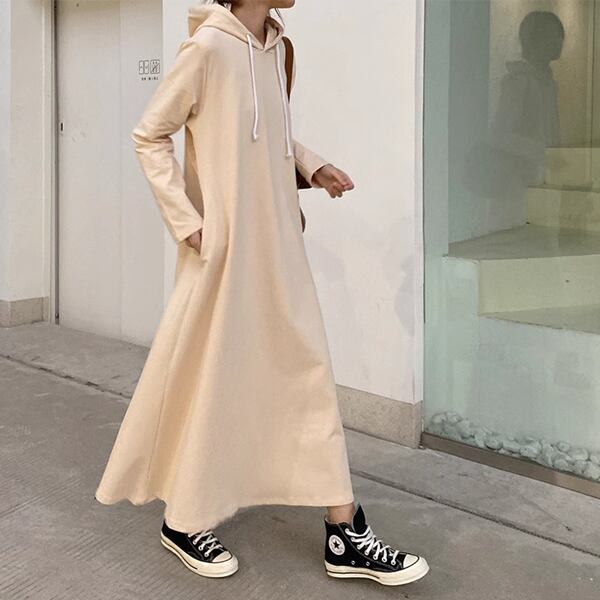 ドレストレーナー。パーカーやスウェットの快適さと、ワンピースの女性らしいフレアなデザインが融合した、スタイリッシュなアイテムです。ロング丈デザインが美しいシルエットを演出。多彩なシーンで活躍するおしゃれで実用的なアイテムです。