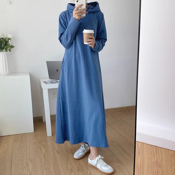 5色展開 ドレストレーナー レディース ワンピース ニット プルオーバー パーカー スウェット オールインワン ドレス フレア ロング 長袖 ラウンドネック フード ワイド フレア Aライン ふっくら ドロスト 綿 かわいい カジュアル おしゃれ エレガント オフィスカジュアル 無地 春 秋 冬 ママ 10代 20代 30代 OL 通勤 通学 アウトドア ショッピング カフェ 韓国 フリーサイズ