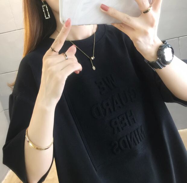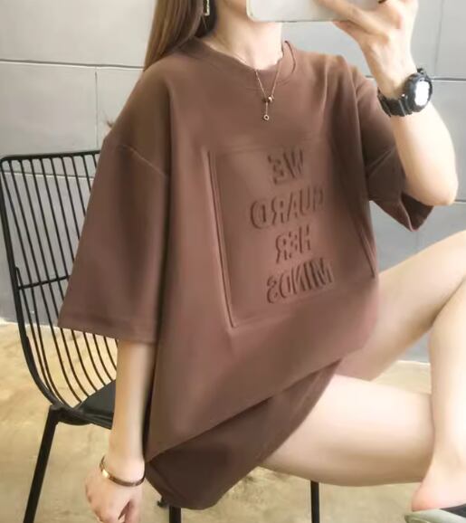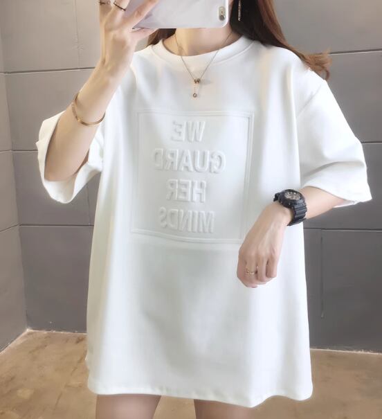 レディース トップス カットソー Tシャツ ミドル丈 半袖 ラウンドネック ストリート 大人可愛い シンプル カジュアル おしゃれ かっこいい ラフ メンズライク ボーイッシュ ルーズ クール ワイルド ハンサム シック スタイリッシュ プリント 文字 テキスト 英語 立体プリント 夏 10代 20代 学生 デート お出かけ 韓国 普段使い 着回し トレンド 流行 M L XL ゆったり ゆる 大きめ オーバーサイズ ホワイト グレー カーキ