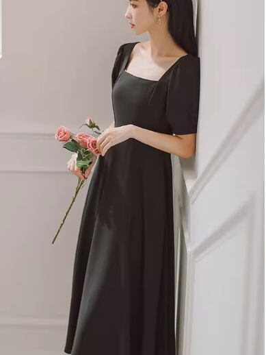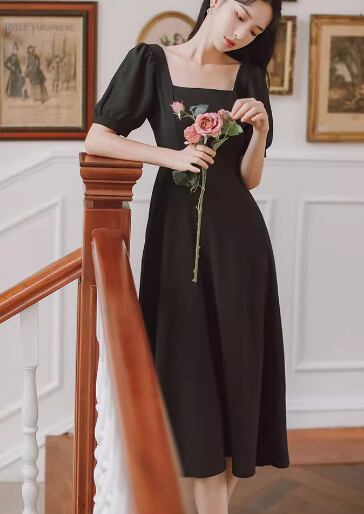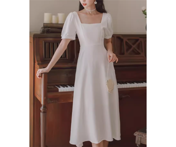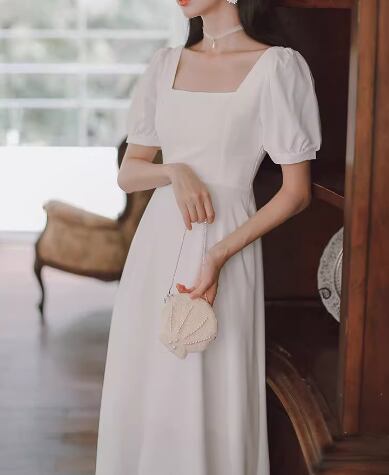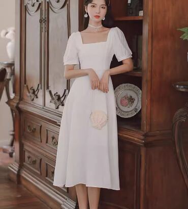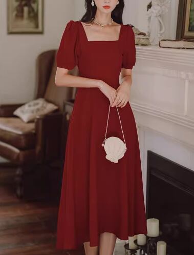 レディース ドレス パーティードレス ウェディング パーティー 結婚式 二次会 披露宴 ミモレ 半袖 パフスリーブ スクエアネック スリム 細身 Aライン ファスナー ハイウエスト きれいめ シンプル 大人可愛い 上品 おしゃれ レトロ ガーリー エレガント クラシック 清楚 シック ナチュラル 高級感 女性らしい 無地 イベント ホテル レストラン デート 食事会 会食 女子会 夏 S M L XL 小さめ ワインレッド ホワイト ブラック