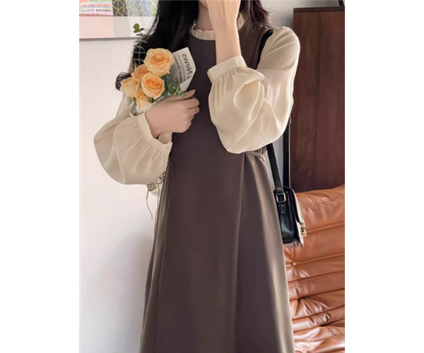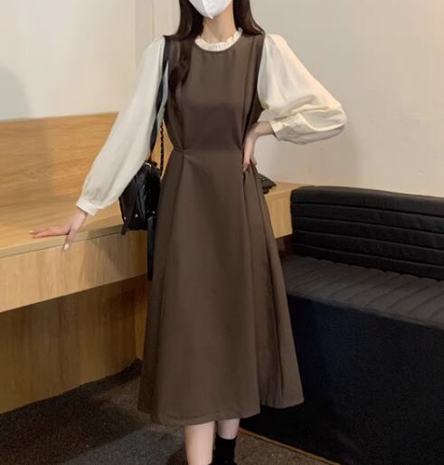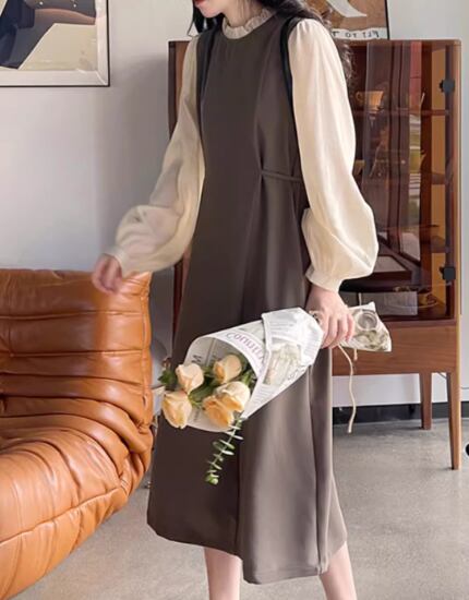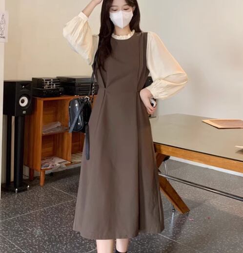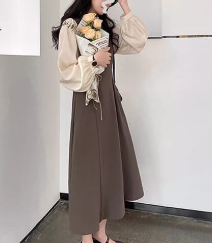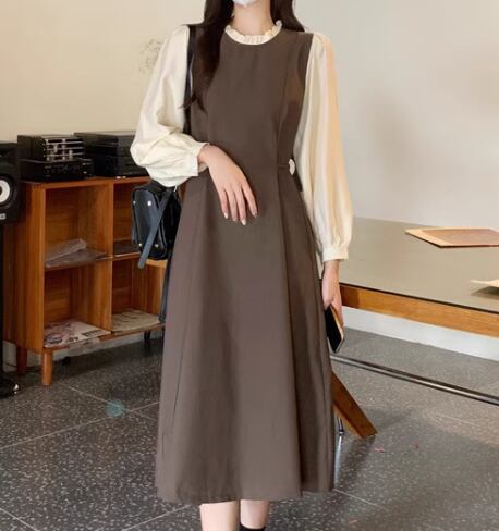 重ね着風 フェイクツーピース レディース ワンピース プルオーバー ミモレ ロング 長袖 ラウンドネック Aライン フリル ハイウエスト かわいい 大人可愛い きれいめ シンプル 上品 おしゃれ レトロ ガーリー ルーズ エレガント ラブリー キュート クラシカル シック 高級感 優しい 穏やか フェアリー 柔らかい 無地 秋 デート お出かけ 体型カバー 普段使い 清楚 M L XL ゆったり ブラウン