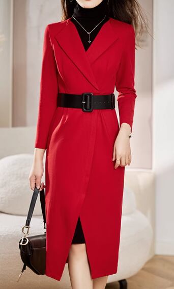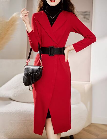 レディース ジャケット ワンピース 膝下 ミモレ 襟付き ベルト ウエストマーク バイカラー きれいめ 上品 おしゃれ かっこいい レトロ クール モード系 エレガント かっちり 都会的 豪華 派手 セレブリティ セクシー デート お出かけ パーティー イベント 韓国 オルチャン コーデ 体型カバー 美脚 脚長 S M L XL 2XL レッド