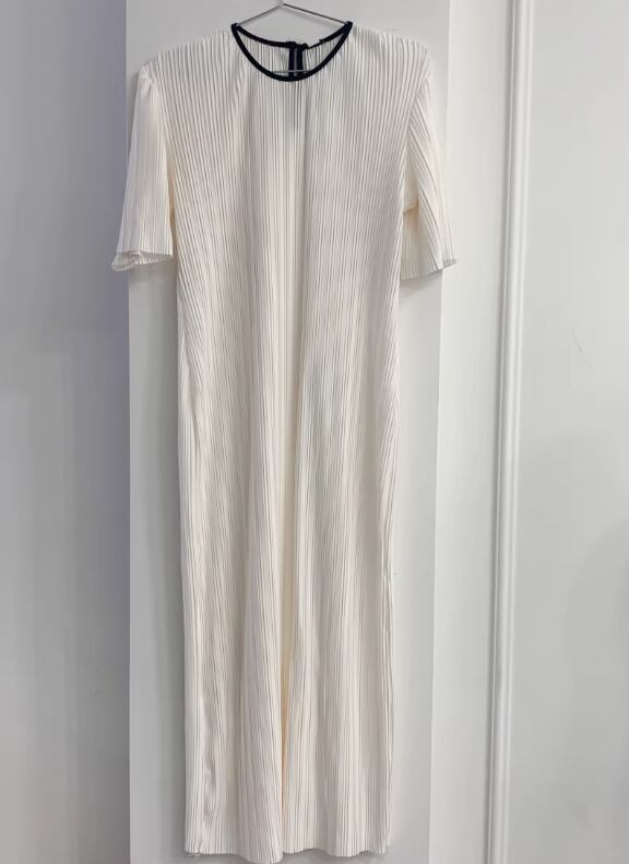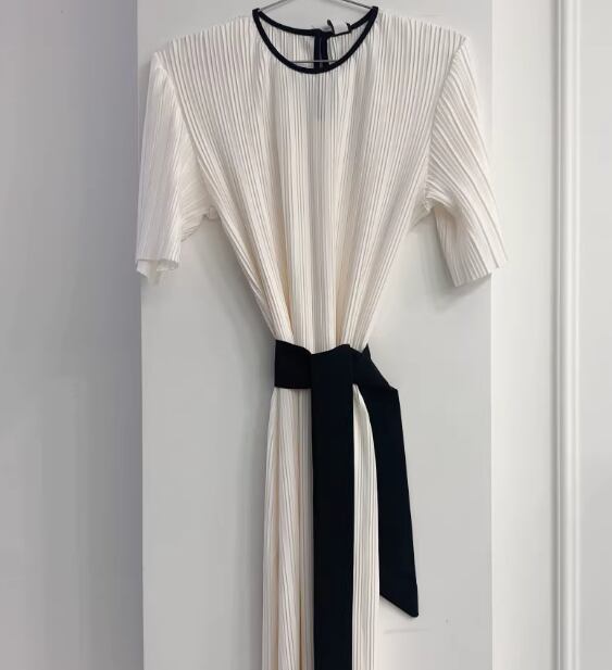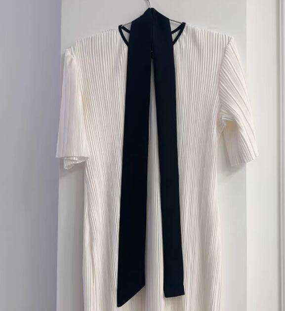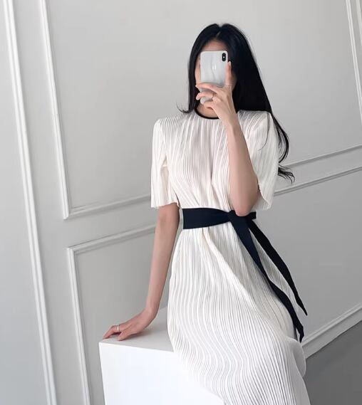 ワンピース ロング マキシ 半袖 5分袖 ラウンドネック プリーツ リボン ベルト ウエストマーク ウエストリボン 伸縮性 切り替えデザイン 配色 薄手 かわいい 大人可愛い シンプル カジュアル 上品 おしゃれ ラフ とろみ感 ナチュラル 無地 夏 デート お出かけ パーティー イベント 韓国 オルチャン コーデ 楽ちん 体型カバー 美脚 脚長 モテ 清楚 トレンド 流行 ゆったり ゆる フリーサイズ 白 ホワイト