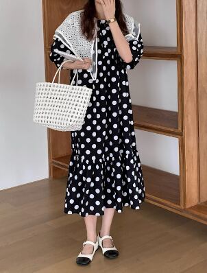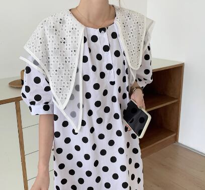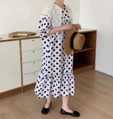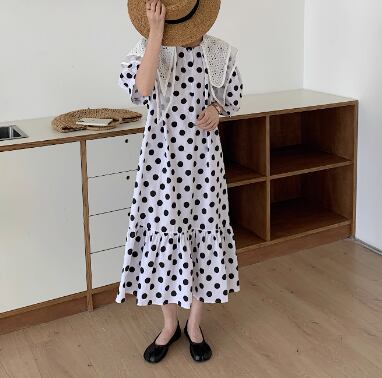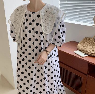 レディース ワンピース マタニティウェア フレア ロング 半袖 パフスリーブ ラウンドネック 襟付き ビッグカラー フレア セミフレア アシンメトリー 裾ワイド レース フリル バイカラー 異素材ミックス 大人可愛い おしゃれ こなれ感 ラフ ガーリー 個性的 主役級 存在感 キュート ロマンティック メルヘン 華やか 水玉 オールシーズン マタニティ デート お出かけ イベント 海 ビーチ 女子会 モテ フリーサイズ ホワイト ブラック