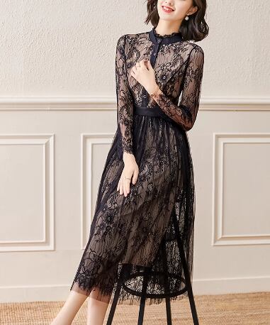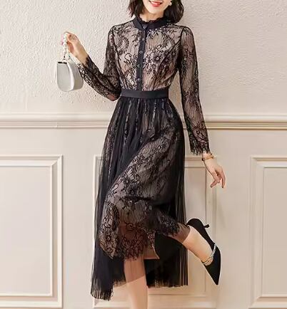 レディース ドレス ワンピース ウェディング パーティー 結婚式 二次会 披露宴 ロング 長袖 スタンドカラー Aライン レース ウエストマーク ハイウエスト プルオーバー きれいめ カジュアル 大人可愛い 上品 おしゃれ ガーリー エレガント 存在感 清楚 シック 華やか 高級感 フェミニン 女性らしい 花柄 フラワー ホテル レストラン デート 食事会 会食 高見え 女子会 春 S M L XL ブラック