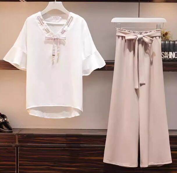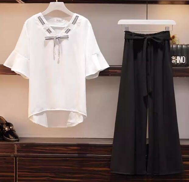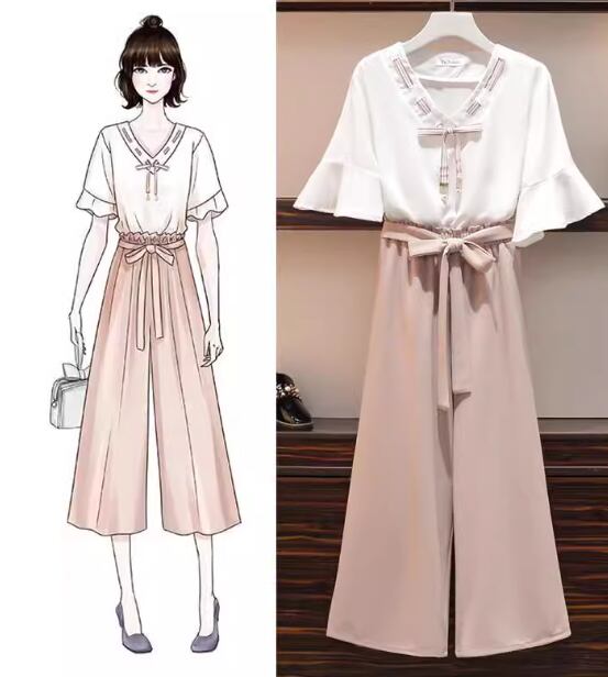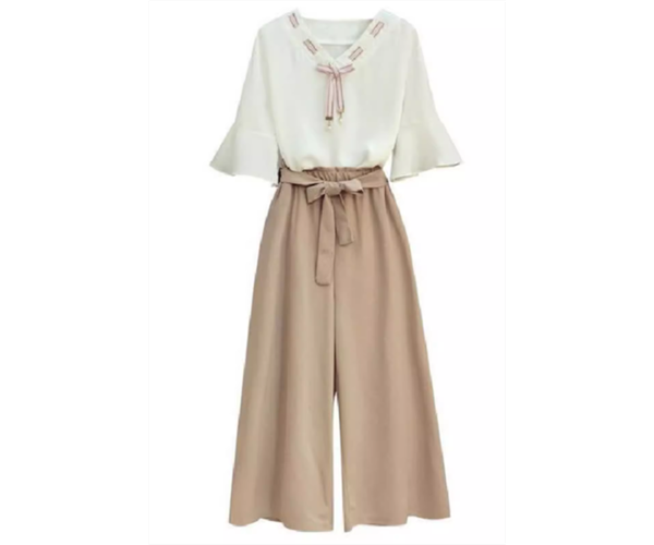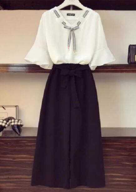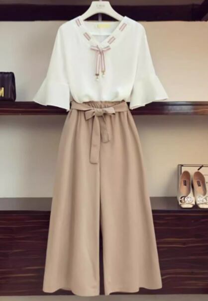 プルオーバータイプのシフォントップスとウエストリボンが可愛いワイドパンツの二点セットです。