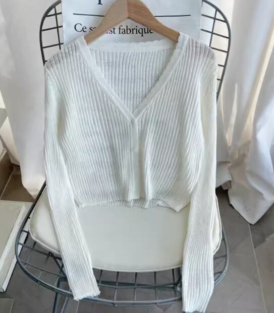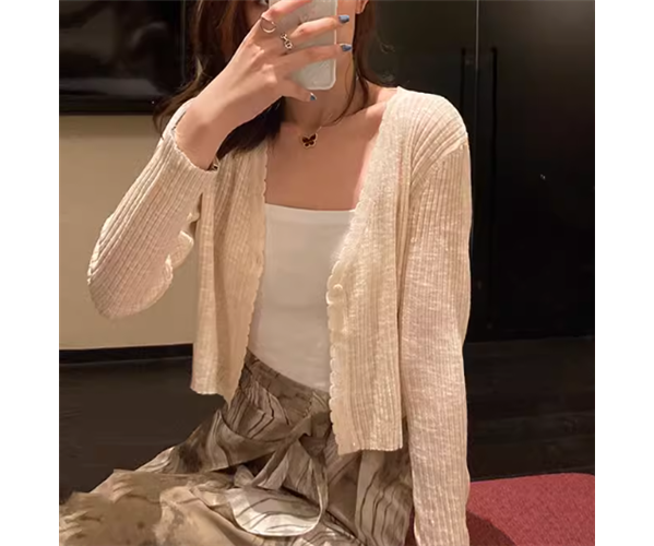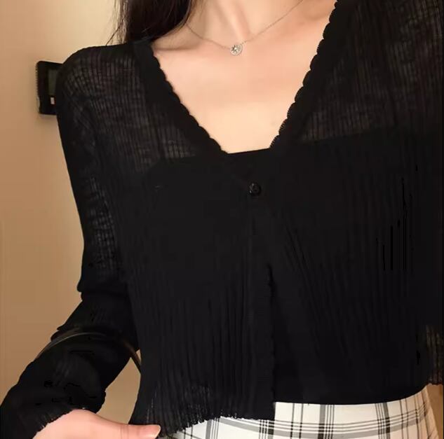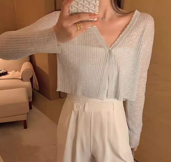 レディース トップス ニット カーディガン ショート 長袖 Vネック 前開き 透け感 ボタン 薄手 大人可愛い きれいめ シンプル カジュアル 上品 おしゃれ レトロ ラフ ルーズ クール エレガント ナチュラル シック 無地 夏 デート お出かけ 重ね着 体型カバー 普段使い 着回し レイヤード トレンド 流行 日焼け防止 日焼け対策 S M L ゆったり ホワイト ブラック ブルー アプリコット