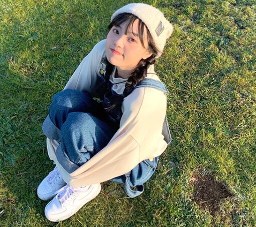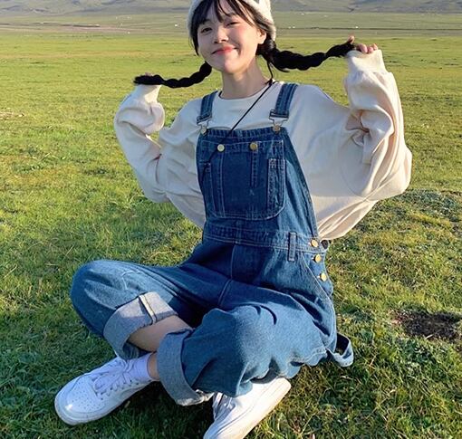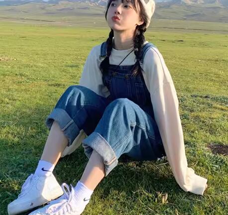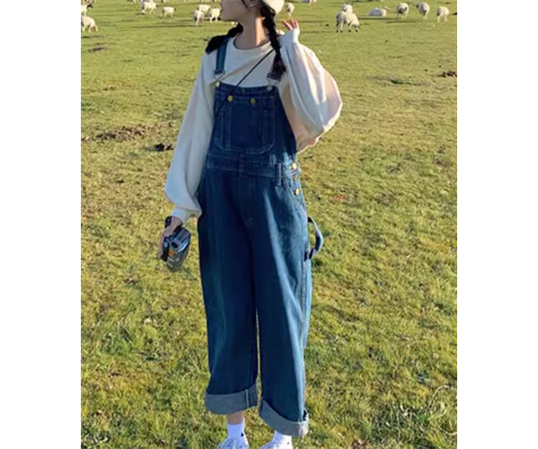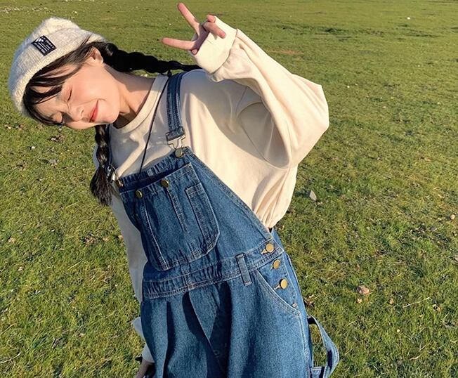 オフホワイトのトレーナーとフルレングスのオーバーオールの二点セット。