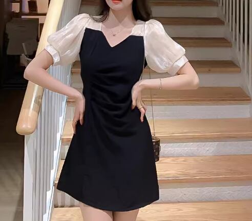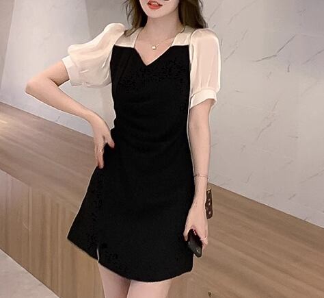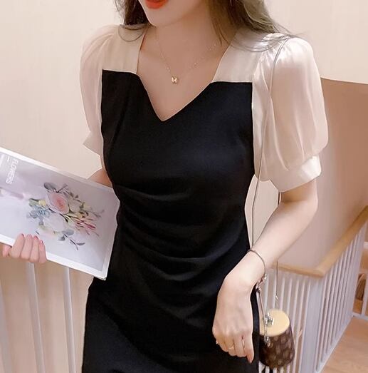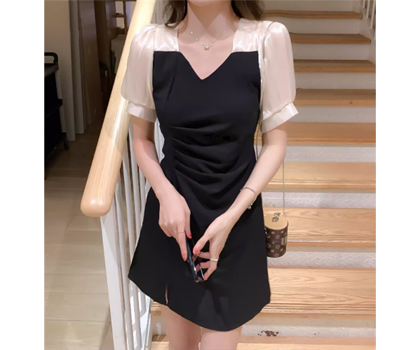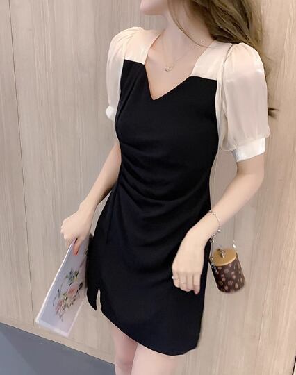 レディース プルオーバー ドレス ミニ ショート 半袖 ボリューム袖 パフスリーブ Vネック スリム 細身 Aライン ハイウエスト 大人可愛い きれいめ シンプル 上品 おしゃれ エレガント ラグジュアリー ナチュラル セクシー シック 高級感 スタイリッシュ 無地 夏 デート お出かけ パーティー イベント モノトーン 普段使い M L XL 小さめ ブラック