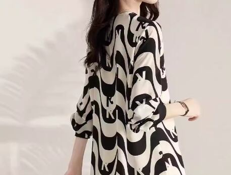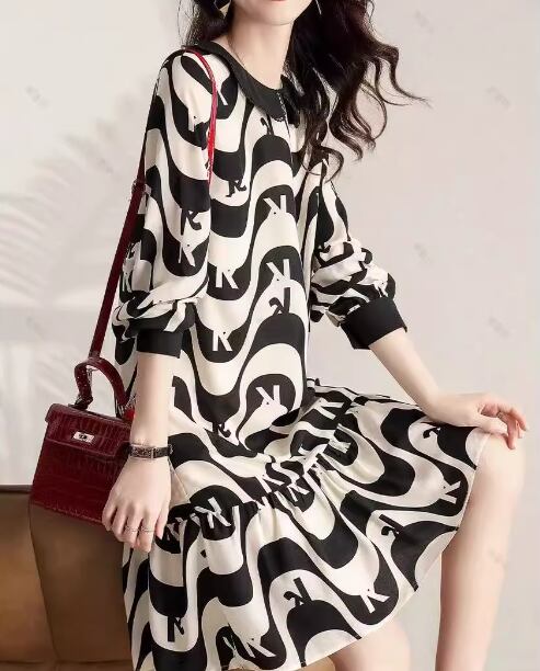 ブラック×ホワイトのモノトーンな色使いが大人可愛い、個性的なプリントのミモレ丈ワンピース。