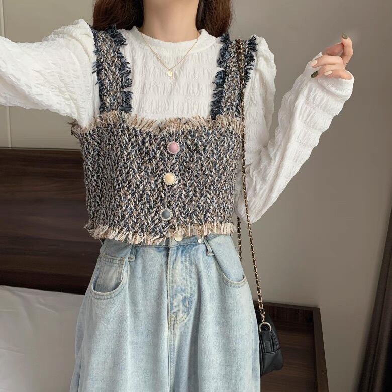 レディース トップス ベスト ショート 袖なし ノースリーブ スクエアネック アシンメトリー フェミニン ボタン フリンジ ツイード かわいい 大人可愛い きれいめ シンプル 上品 おしゃれ かっこいい レトロ ガーリー ヴィンテージ ラブリー キュート ラグジュアリー クラシカル ベーシック アクティブ ロマンティック 秋 冬 デート お出かけ 旅行 女子会 休日 カフェ 重ね着 普段使い 着回し レイヤード モテ 清楚 トレンド 流行 インスタ映え 定番 M L XL 黒 ブラック ベーシックカラー