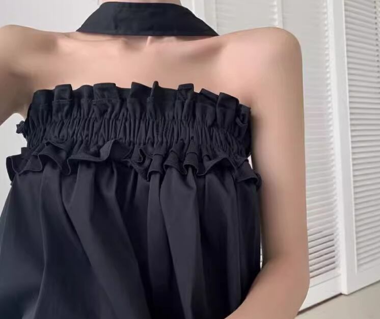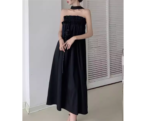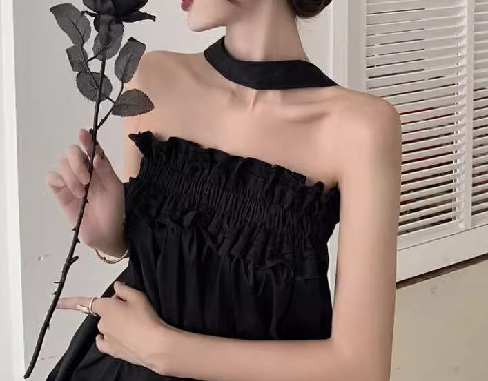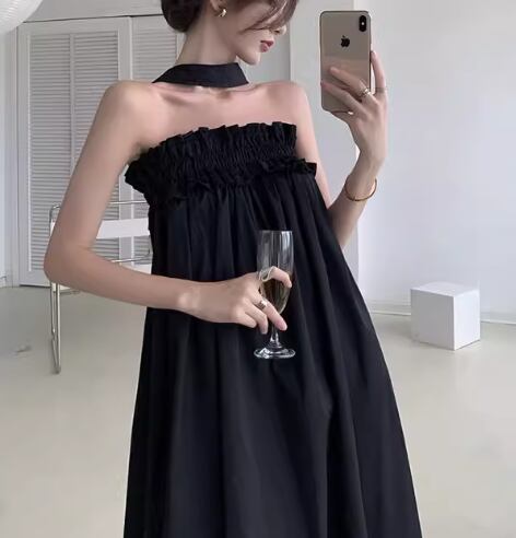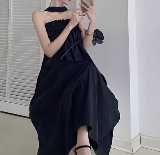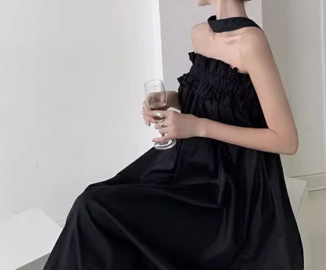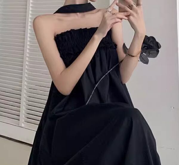 シックなブラック×ホルターネックデザインが大人可愛い、ロング丈のノースリーブドレス。