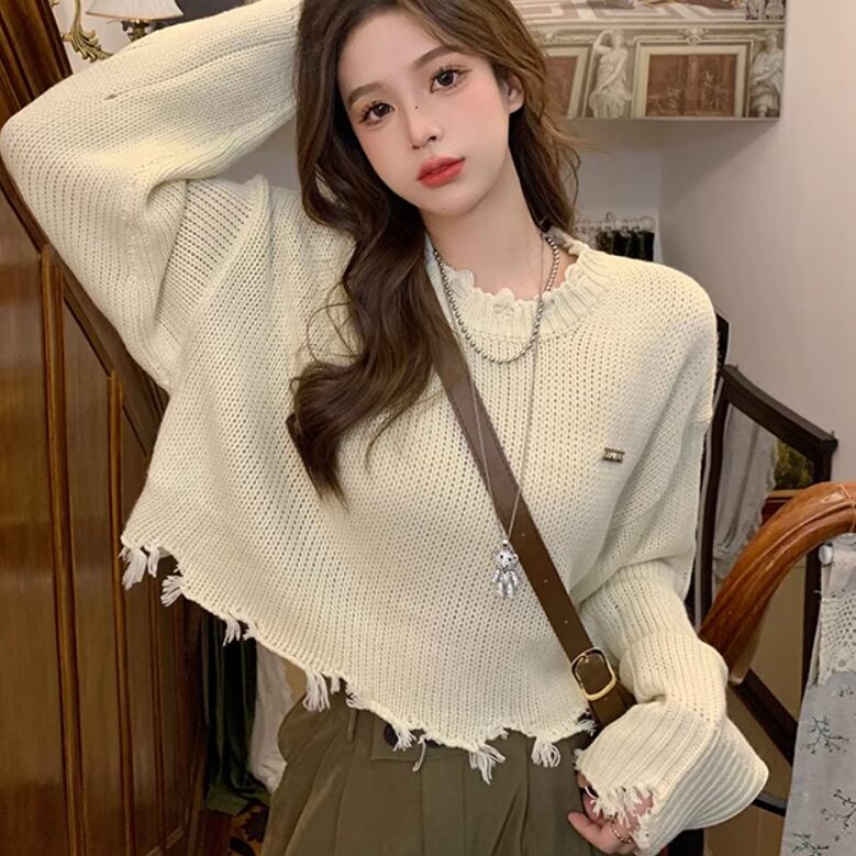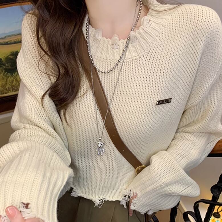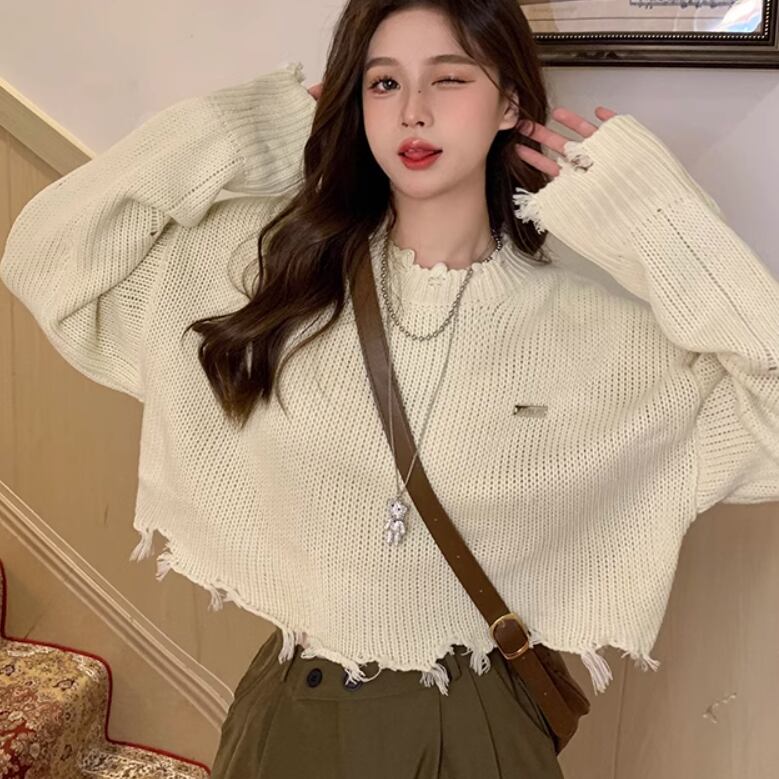 穴あきでショート丈のラフエッジ長袖セーター