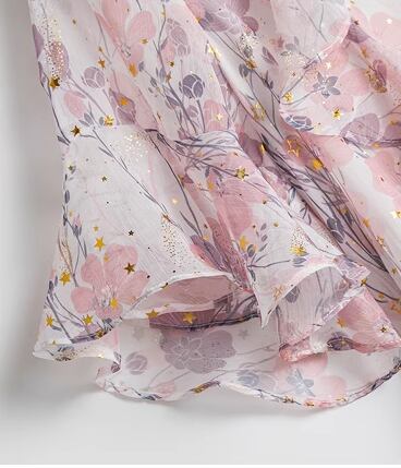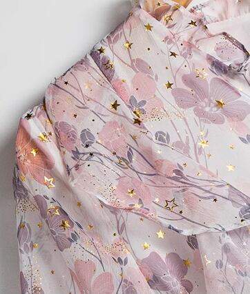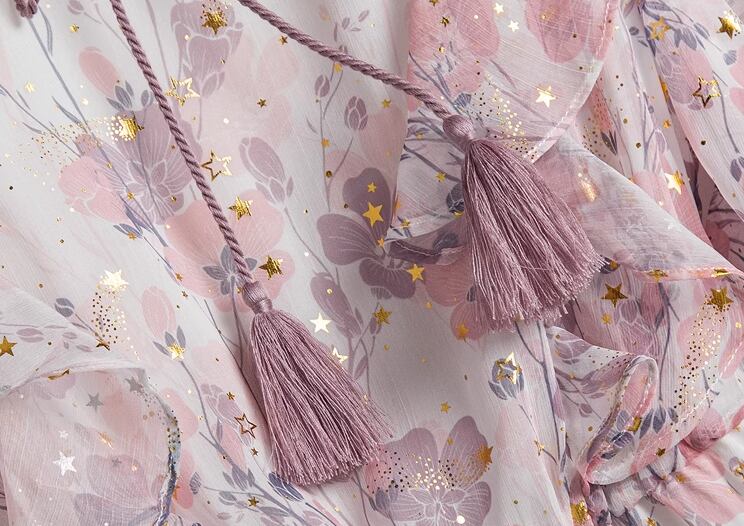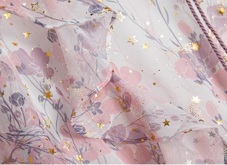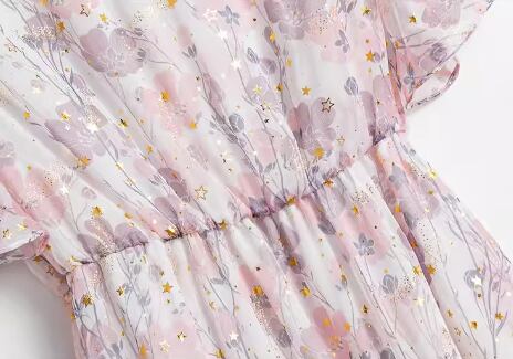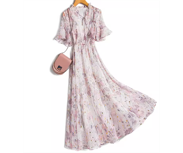桜を連想させるような淡いピンク色と華やかで女性らしい花柄のプリントが可愛い、半袖のシフォンワンピース。